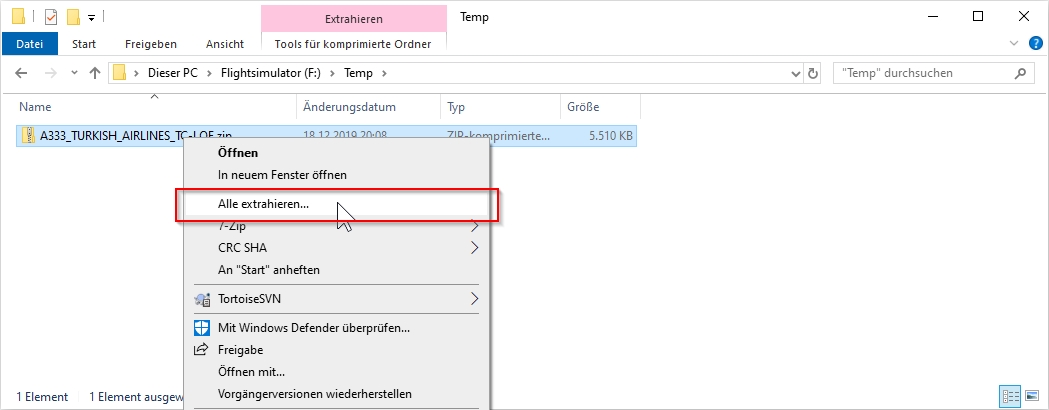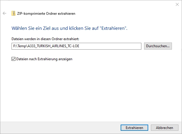Copy the repaint archive from your download folder to a temporary directory (e.g. D:\Temp), then right-click it and select "Extract All" (see image 1). This unpacks the contents of the file into a subdirectoy of the temporary directory which has the name of the archive file. For example, A333_TURKISH_AIRLINES_TC-LOE (see image 2)