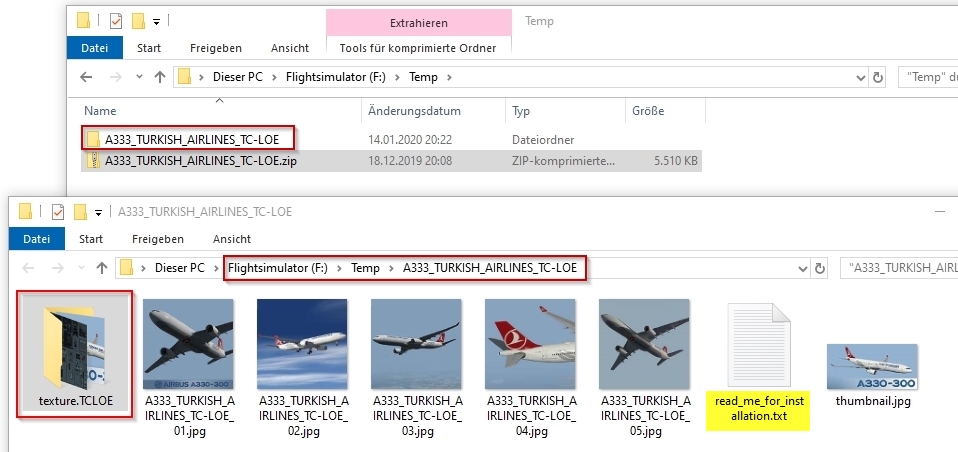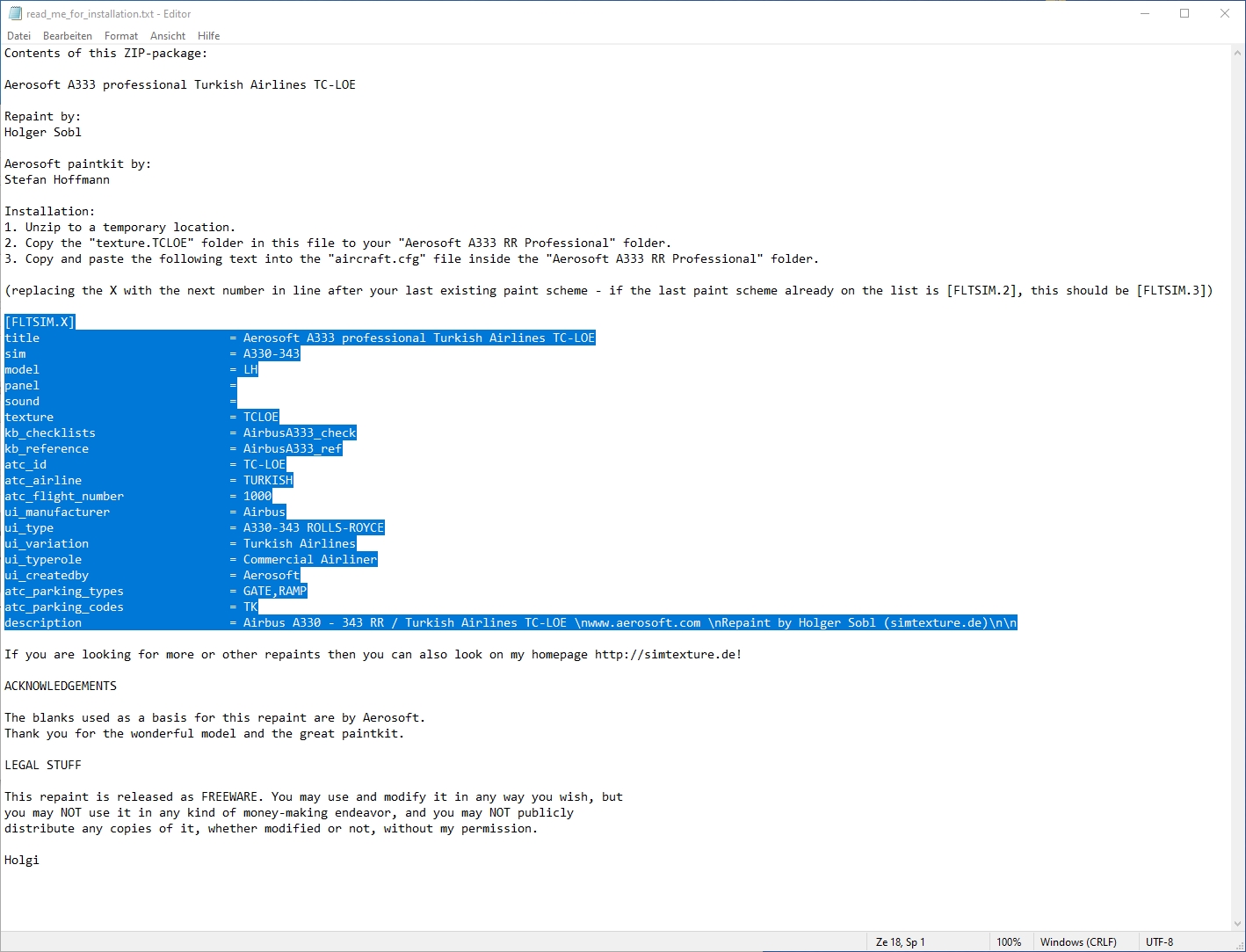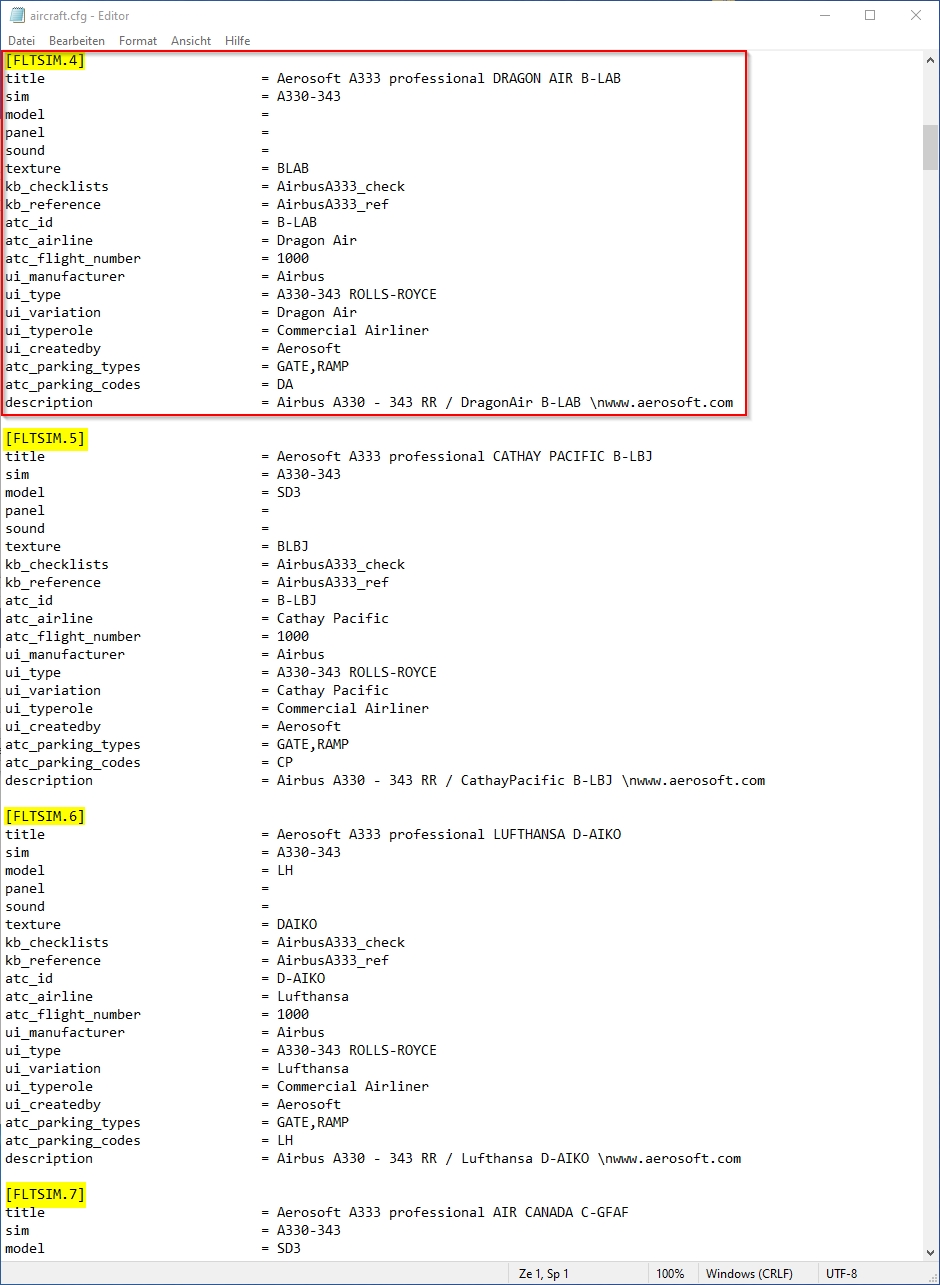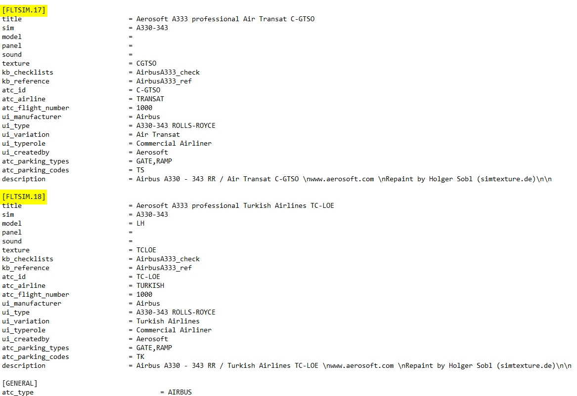 For information: Extract (unzip) the downloaded repaint archive file: image 1 image 2 Now enter the newly created folder A333_TURKISH_AIRLINES_TC-LOE and copy the folder "texture.XXX" (XXX equals the aircraft′s registration, as marked in image 3) into your aircraft′s root folder (see image 4), which is F:\P3D4 Add-ons\Aerosoft A330 Professional\SimObjects\Airplanes\Aerosoft\Aerosoft A330 RR Professional\ on my PC here. On yours it can be slightly different. image 3 image 4 Create entries for the aircraft.cfg: F:\P3D4 Add-ons\Aerosoft A330 Professional\SimObjects\Airplanes\Aerosoft\Aerosoft A330 RR Professional\ The entries in the aircraft.cfg must be so that the simulator knows where the repaint′s textures are located. For this purpose, they are already prepared in the readme_for_installation.txt file. (see image 3 and image 5) image 5 After opening readme_for_installation.txt in the Windows Notepad, select lines as shown in image 5 (selected lines are marked blue). Then select "Copy" from the "Edit" menu. (image 6) image 6 Open the aircraft.cfg in Windows Notepad and paste the copied lines at the end of the already existing liveries. Image 8 explains how to find the end of the list. The file begins with the first livery and the entry [FLTSIM.0], the second the [FLTSIM.1]. On (image 7) you can see how far the [FLTSIM.4] goes and when the area of the [FLTSIM.5] starts. In addition, I have colored the next ones, so you should also recognize the [FLTSIM.6] and [FLTSIM.7]. image 7 The end of the listing of all liveries begins with the new section [GENERAL]. There is the point at which you insert the new entry as described above in (Image 5). In this example I added the lines after [FLTSIM.17] and before [GENERAL]. (images 8 and 9) image 8 The entry should now look like the in the following picture (image 9). image 9 Before you save the changes, you should add the next number to [FLTSIM.X]. In this example, the X needs to be replaced with the "18" (see image 10). If you your last livery index is different than in this example, use yours, increment it by 1 and replace X with it. For example: if the last entry is [FLTSIM.5] replace the [FLTSIM.X] with [FLTSIM.6]. image 10 Now close and save the aircraft.cfg. Everything′s done.2.1 How to install a repaint?