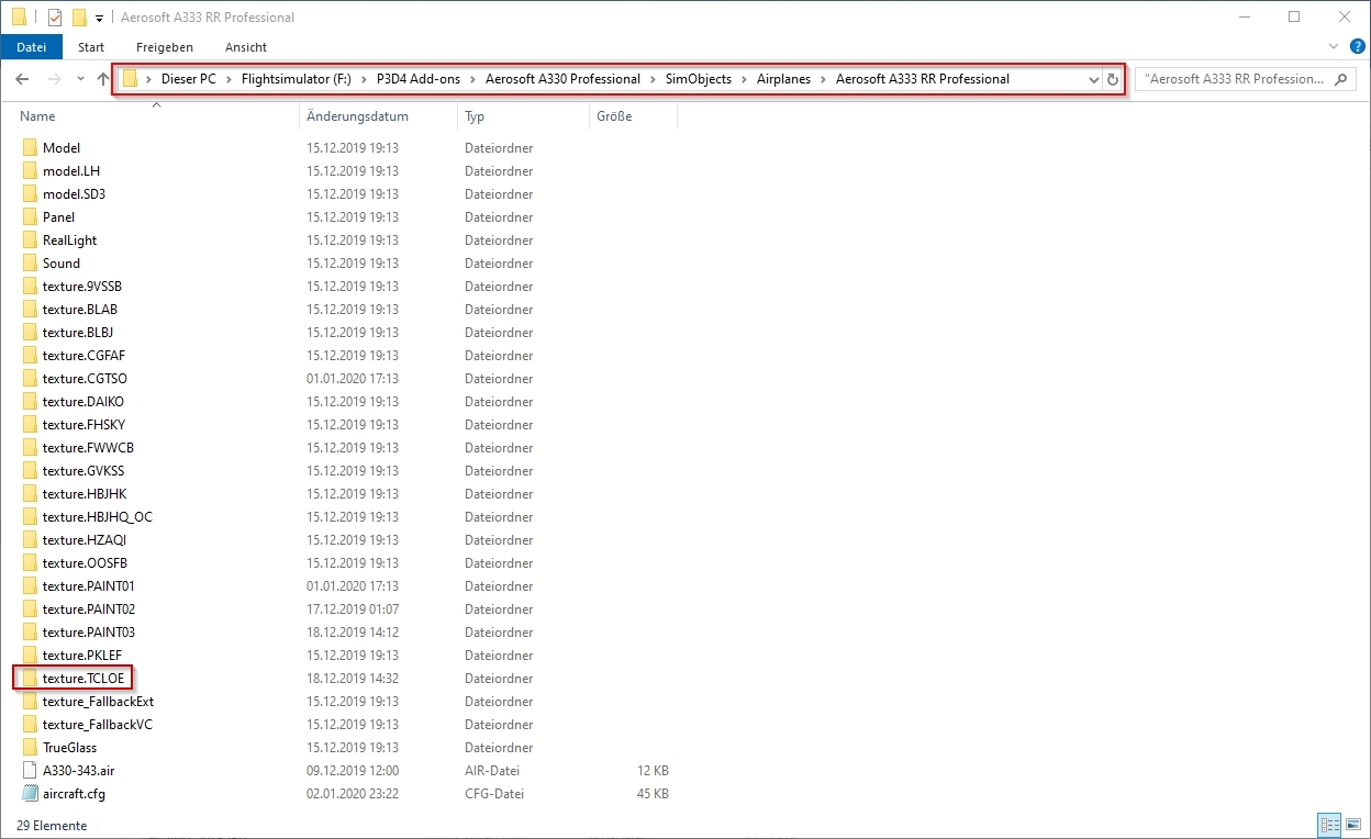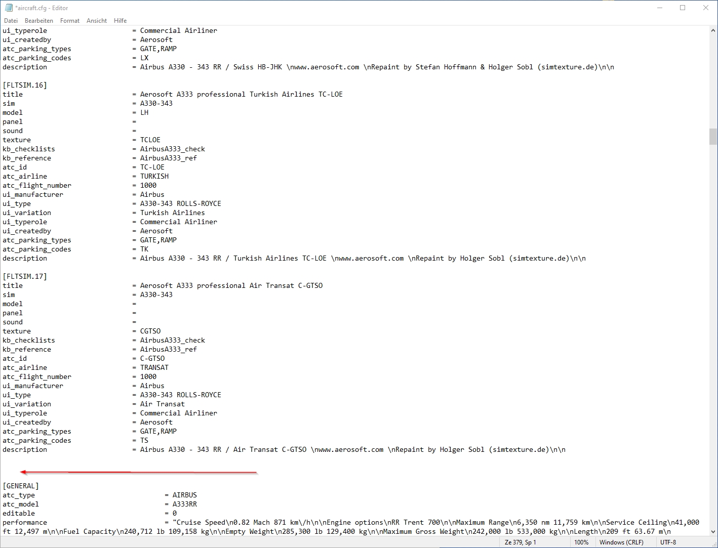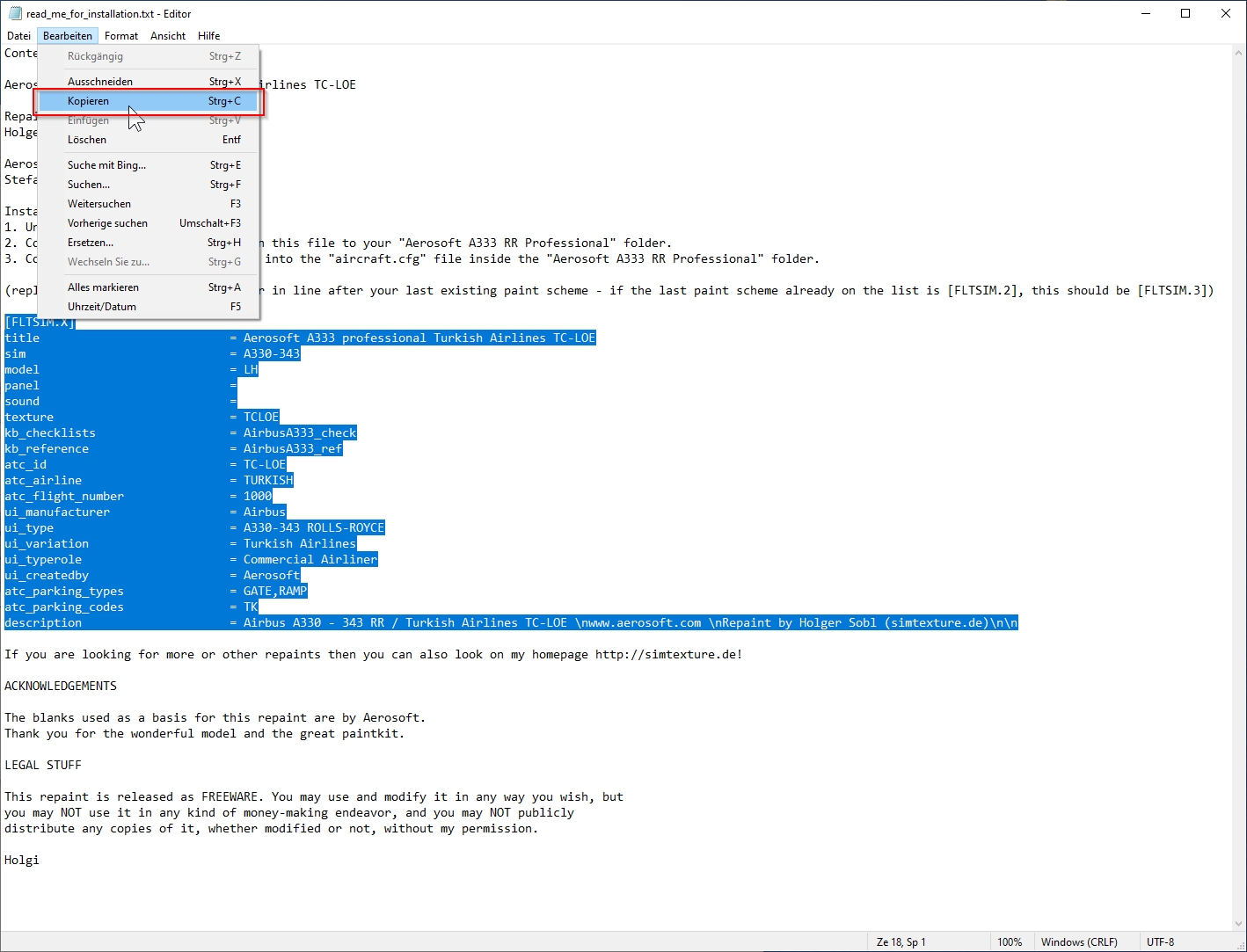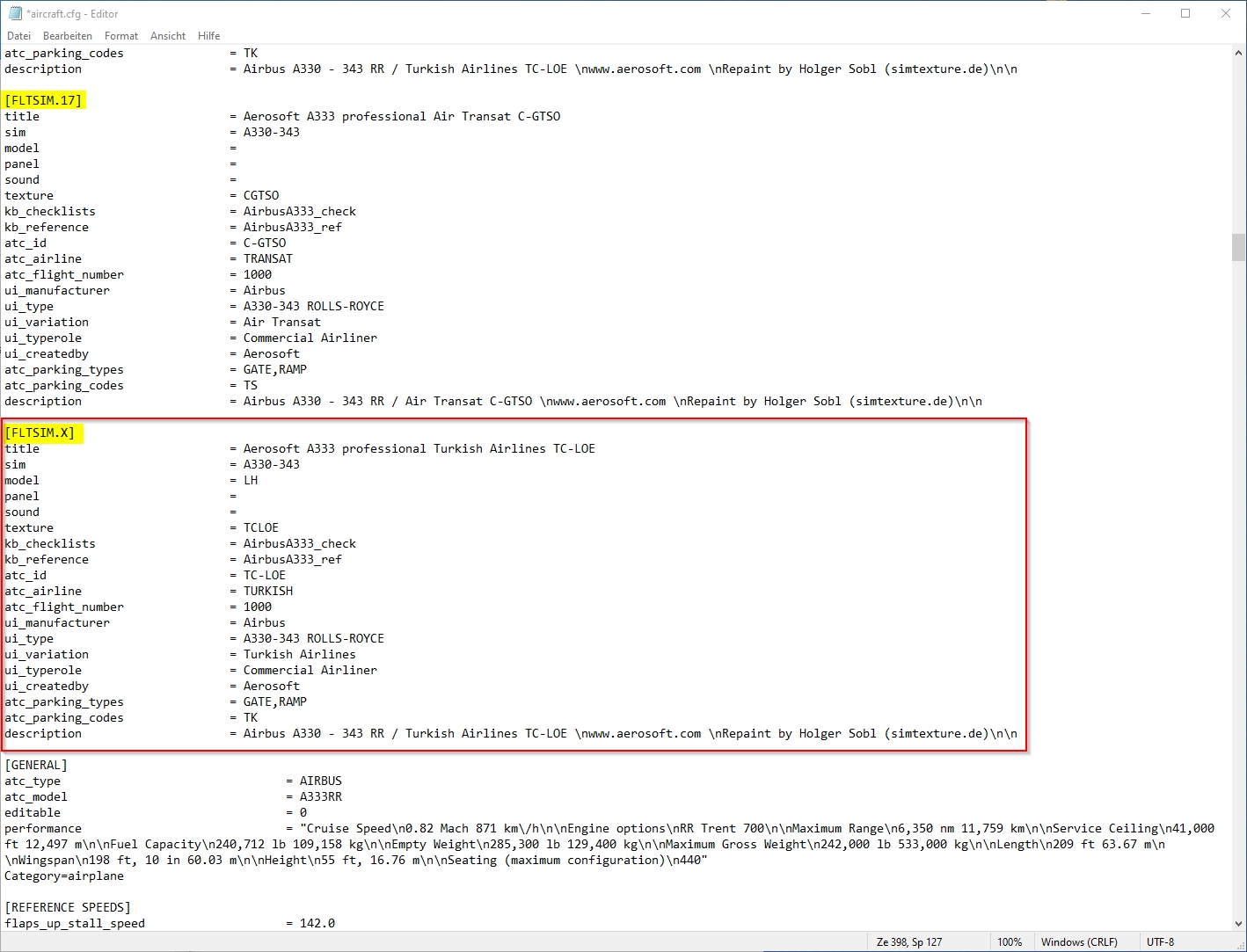 For information: Extract (unzip) the downloaded repaint archive file: image 1 image 2 Now enter the newly created folder A333_TURKISH_AIRLINES_TC-LOE and copy the folder "texture.XXX" (XXX equals the aircraft′s registration, as marked in image 3) into your aircraft′s root folder (see image 4), which is F:\P3D4 Add-ons\Aerosoft A330 Professional\SimObjects\Airplanes\Aerosoft\Aerosoft A330 RR Professional\ on my PC here. On yours it can be slightly different. image 3 image 4 Create entries for the aircraft.cfg: F:\P3D4 Add-ons\Aerosoft A330 Professional\SimObjects\Airplanes\Aerosoft\Aerosoft A330 RR Professional\ The entries in the aircraft.cfg must be so that the simulator knows where the repaint′s textures are located. For this purpose, they are already prepared in the readme_for_installation.txt file. (see image 3 and image 5) image 5 After opening readme_for_installation.txt in the Windows Notepad, select lines as shown in image 5 (selected lines are marked blue). Then select "Copy" from the "Edit" menu. (image 6) image 6 Open the aircraft.cfg in Windows Notepad and paste the copied lines at the end of the already existing liveries. Image 8 explains how to find the end of the list. The file begins with the first livery and the entry [FLTSIM.0], the second the [FLTSIM.1]. On (image 7) you can see how far the [FLTSIM.4] goes and when the area of the [FLTSIM.5] starts. In addition, I have colored the next ones, so you should also recognize the [FLTSIM.6] and [FLTSIM.7]. image 7 The end of the listing of all liveries begins with the new section [GENERAL]. There is the point at which you insert the new entry as described above in (Image 5). In this example I added the lines after [FLTSIM.17] and before [GENERAL]. (images 8 and 9) image 8 The entry should now look like the in the following picture (image 9). image 9 Before you save the changes, you should add the next number to [FLTSIM.X]. In this example, the X needs to be replaced with the "18" (see image 10). If you your last livery index is different than in this example, use yours, increment it by 1 and replace X with it. For example: if the last entry is [FLTSIM.5] replace the [FLTSIM.X] with [FLTSIM.6]. image 10 Now close and save the aircraft.cfg. Everything′s done.2.1 How to install a repaint?